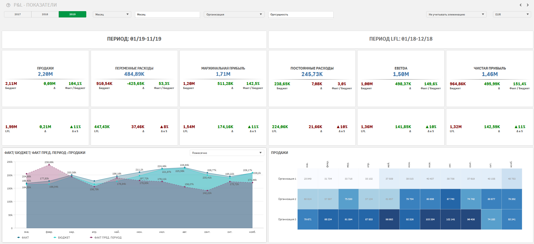 Приложениеа позволяет просмотреть тренд показателей P&L с сопоставлением данных LFL в любой комбинации отборов, проанализировать структуру статей и долевое участие их составляющих. Механизм "Что если" позволяет увидеть изменение структуры прибыли предприятия, в зависимости от изменений базовых показателей.