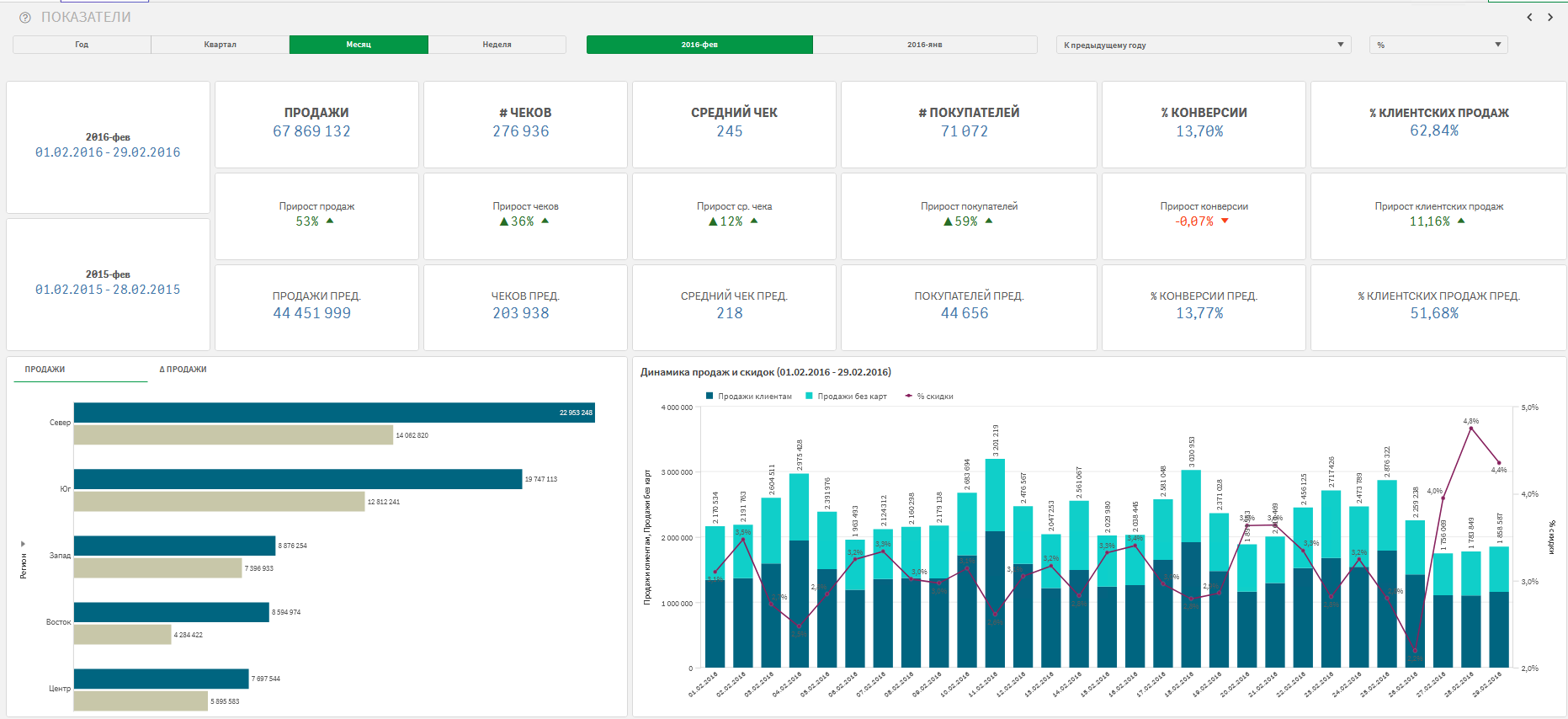 Решение позволяет выполнять анализ чеков компании 360° во всех требуемых разрезах: точки продажи (регионы, магазины, кассы, кассиры и т.п.), товары и все имеющиеся группировки, дисконтные карты и классификация клиентской базы (пол, возраст и т.п.). В приложении анализируется кол-во чеков, средний чек, объем продаж, кол-во покупателей, % конверсии, % продаж с картой лояльности, тип оплаты и предоставленной скидки, сумма начисленных и использованных бонусов по дисконтным картам, количество позиций в чеках и пенетрация